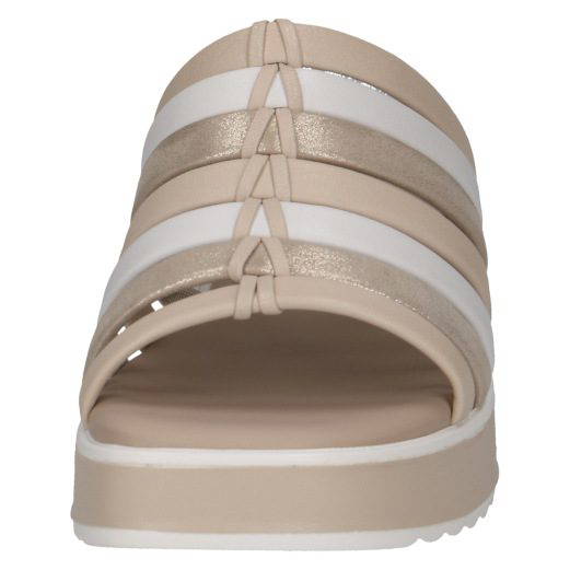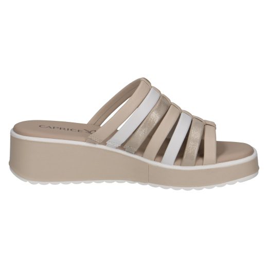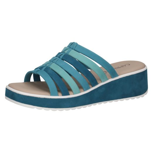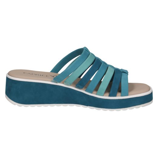 These contemporary looking sandals/sliders are from our Caprice Range. The wedge heel gives you elevation and the cushioned footbed ensures all-day comfort. These are light and easy to wear and make a great addition to your summer wardrobe. They come in two colours: a white/gold combination and a turquoise blue mix.