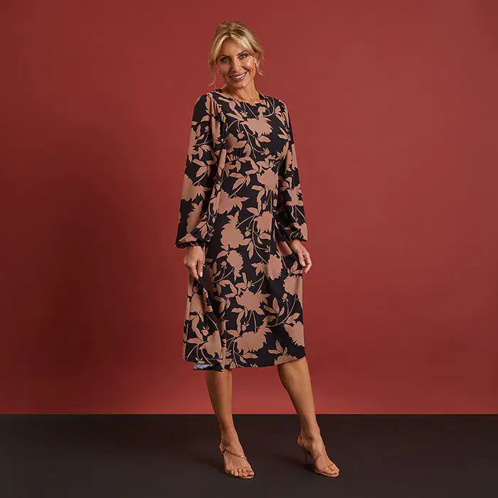 This dress has a puff sleeve with elasticated cuff. It has an elasticated waist with a small cut out detail at the back that has been designed to not show any bra straps. It is a midi length and would like great teamed with heels or boots the choice is yours.