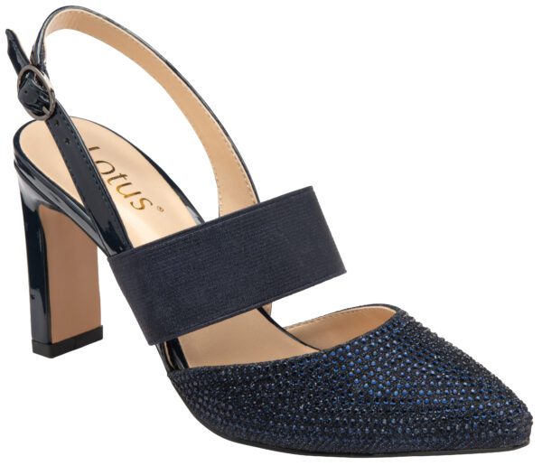 Glamorous soirees certainly call for the Lotus Joie court shoe. With a multitude of sparkling diamantes emblazoned on the pointed toe and resting on an on-trend chiselled 9cm block heel, this women’s silver court shoe is a stunning silhouette. This Lotus ladies’ heeled pump also boasts a wide elasticated strap across the foot and an adjustable slingback to improve fit and wear. For the ultimate finish to a red carpet look team the Joie court shoe with the coordinating Lotus Lule handbag.
