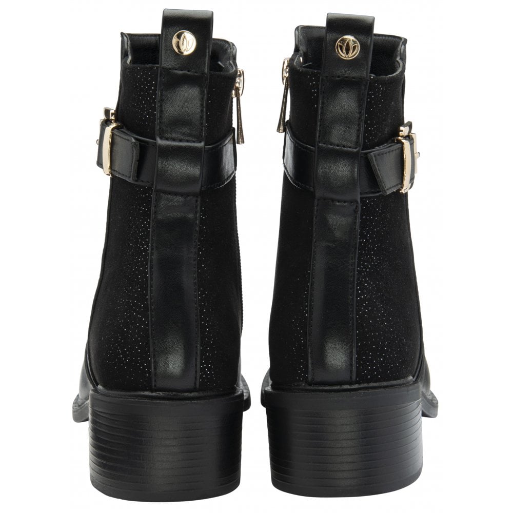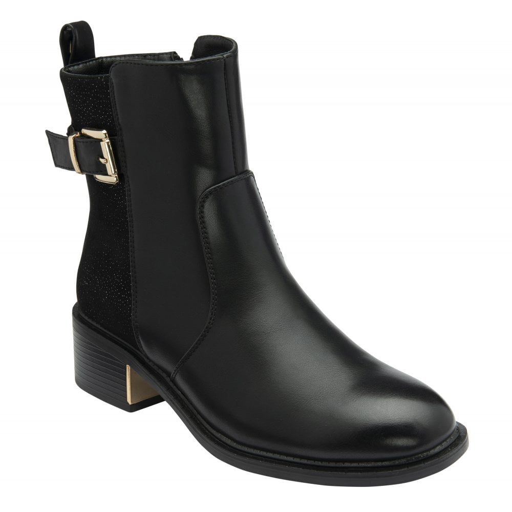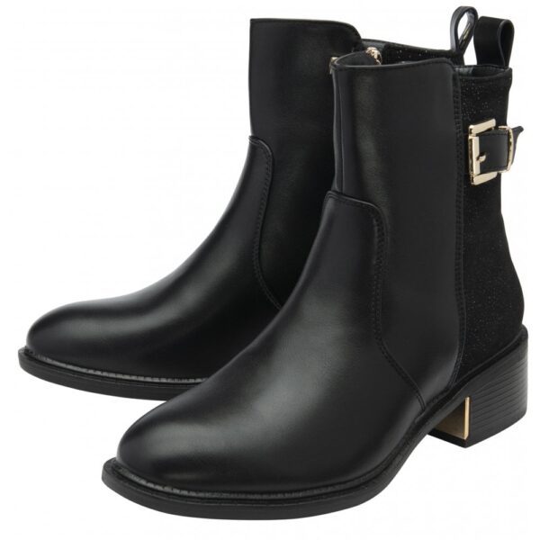 Elevate any look with the Lotus Alannah ankle boot. This women’s black boot is a timeless style that has a clean aesthetic. Constructed from faux leather and with a soft almond pointed toe, plus subtle touches including a decorative buckle on the side and a mirrored plate on the 4.5cm block heel. Giving this Lotus black boot an eye-catching finish is the sparkly imi suede back panel that ensures it will transition day to night looks effortlessly.